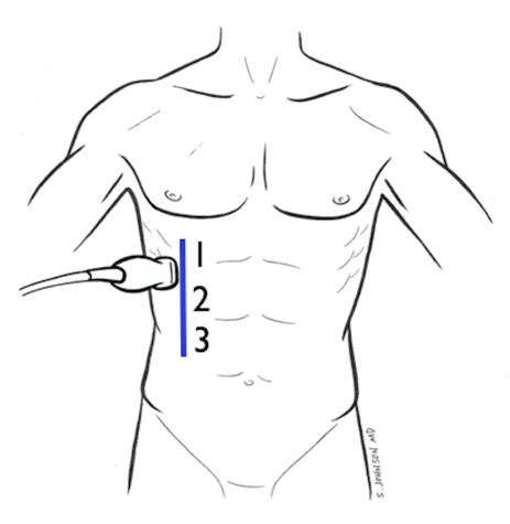 eFAST 右上腹 (RUQ) 视图 1 图示