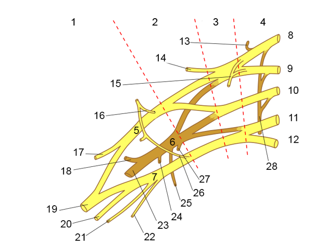 肌间沟神经阻滞 - 臂丛神经图 束 分支 干 根 外侧束 后束 内束 C5 C6 C7 C8 T1 背部肩胛骨神经 肩胛神经 锁骨下肌神经 胸外侧神经 肌皮神经 腋神经 正中神经 尺神经 前臂内侧皮神经 手臂的内侧皮神经 桡神经 下肩胛下神经 胸背神经 胸内侧神经 上肩胛下神经 胸长神经 https://upload.wikimedia.org/wikipedia/commons/thumb/0/0e/Brachial_plexus_2.svg/750px-Brachial_plexus_2.svg.png