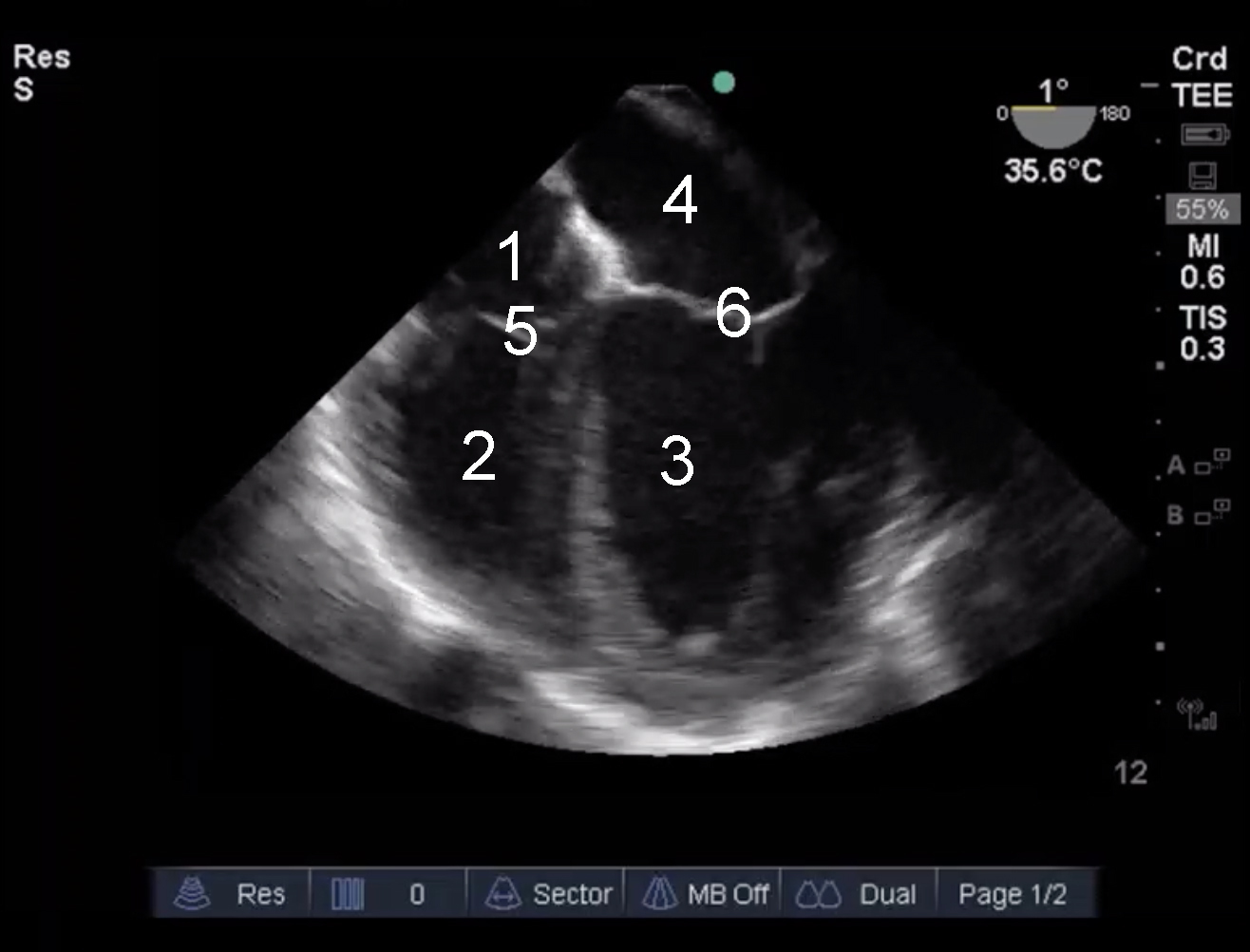 Cardiac 2 TEE Mid Esophageal 4 Chamber Image Right Atrium (RA) Right Ventricle (RV) Left Ventricle (LV) Left Atrium (LA) Tricuspid Valve Mitral Valve