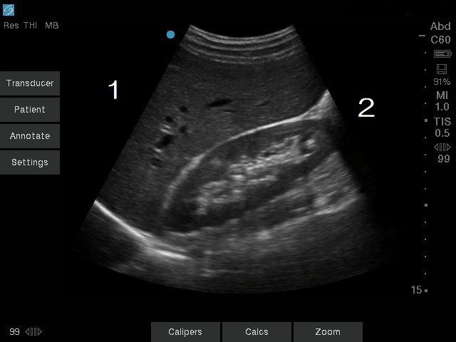 Coronal Transducer Orientation Liver and Right Kidney Image Toward Patient's Head Toward Patient's Feet