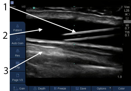 2. Hypoechoic: a substance that sends few sound wave back to the transducer (grey)