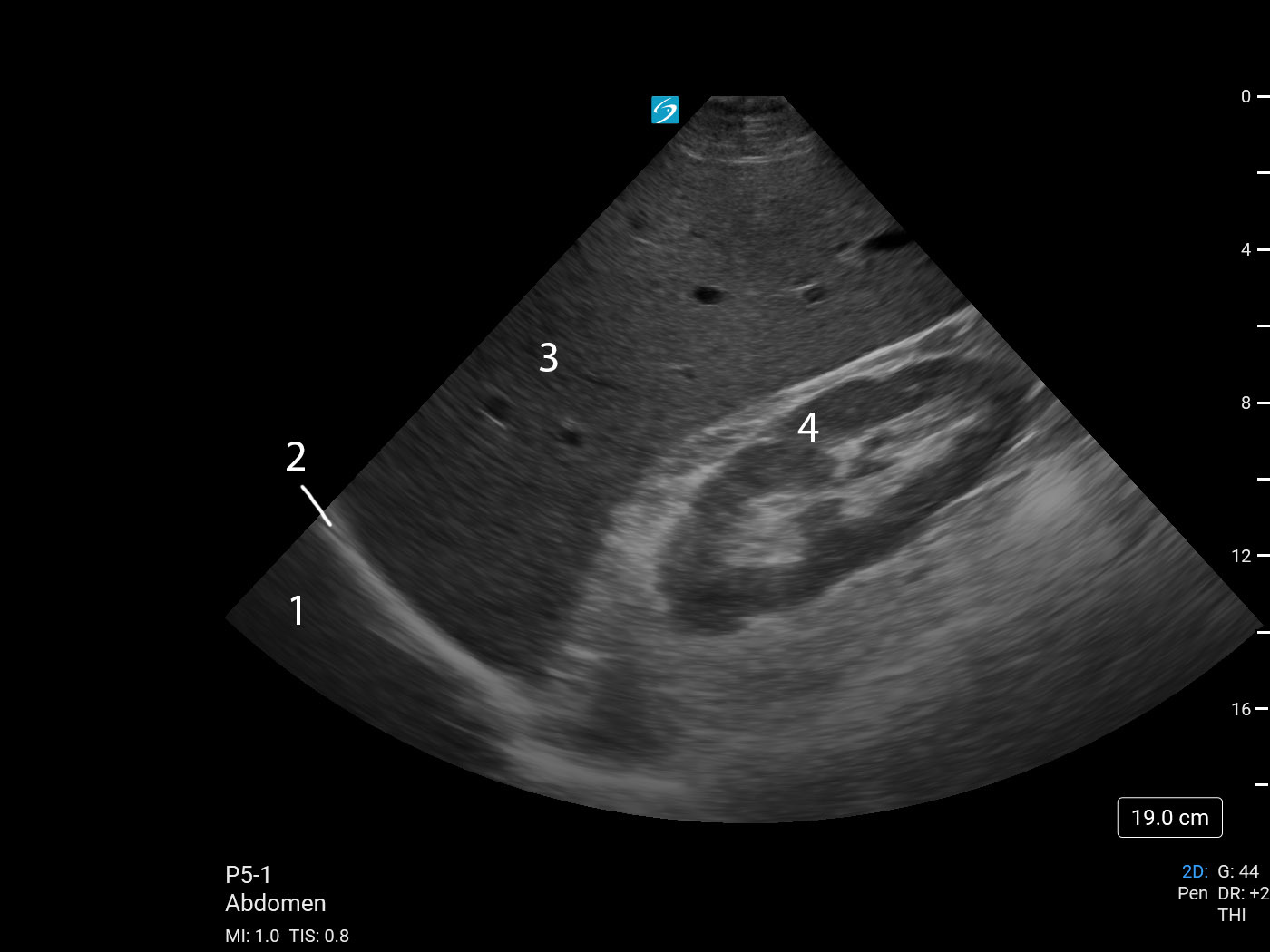 eFAST Right Upper Quadrant (RUQ) View 2 (Sonosite PX P5-1) Image Pleural Space Diaphragm Liver Right Kidney