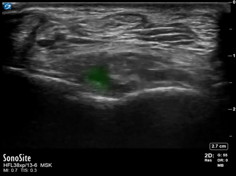 Foot & Ankle Anterior Recess Tibiotalar Joint Short Axis Image Highlighted Area: Small Effusion in the Tibiotalar Joint