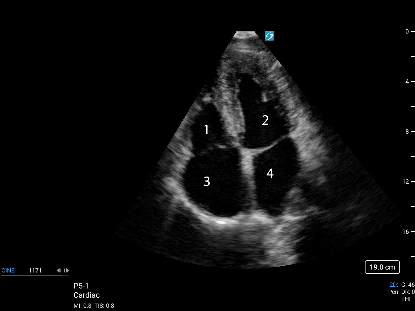 Heart Apical 4 Chamber View (Sonosite PX P5-1) Image Right Ventricle (RV) Left Ventricle (LV) Right Atrium (RA) Left Atrium (LA)