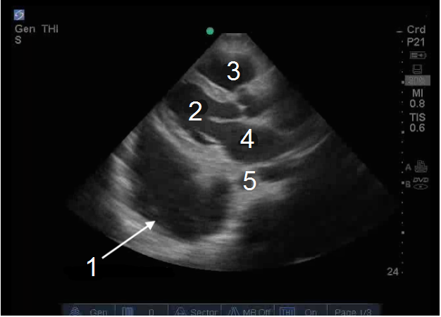 Heart Parasternal Long Axis (PLAX) Pleural Fluid 1 Image Large Pleural Effusion (Fluid) Left Ventricle (LV) Right Ventricle (RV) Left Atrium (LA) Aorta (Ao)