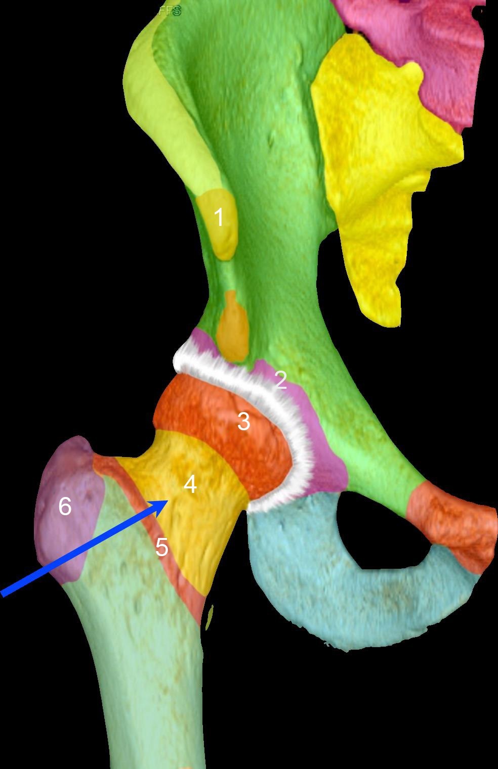 Hip Injection Anatomy Image ASIS Acetabulum Femoral Head Femoral Neck Intertrocanteric Line Greater Trochanter Blue arrow shows suggested orientation for needle