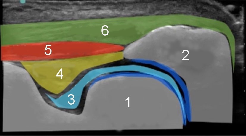 Bild 2: Ellbogen, intraartikuläre Injektion, posteriorer Recessus Trochlea humeri, posterior Olecranon Posteriore Ausbuchtung Fettkörper Trizeps-Muskel Sehne d. Trizeps