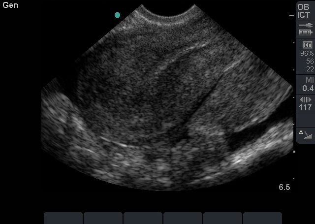 Bild 2: Transvaginaler (TV) Ultraschall des Beckens, ektopische Schwangerschaft, sagittal, leerer Uterus mit freier Flüssigkeit