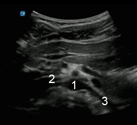 Bild: Aorta, Arteria mesenterica superior (AMS), Arteria renalis Aorta (Ao) Rechte Arteria renalis (RAR) Linke Arteria renalis (LAR)