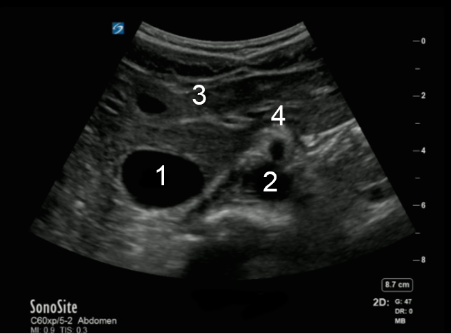 Bild: Aorta, Arteria mesenterica superior (AMS), transversal Vena cava inferior (VCI) Aorta (Ao) Leber Arteria mesenterica superior (AMS)
