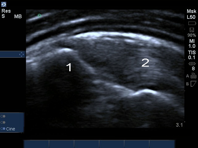 Bild: Defekt im Insertionsbereich der Supraspinatussehne an der Schulter (ZOOM) Intratendinöse Ruptur der gemeinsamen Sehnenplatte an der Schulter (ZOOM) Tuberculum majus Supraspinatus