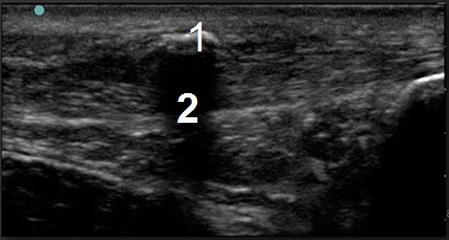 Bild: Fuß und Sprunggelenk, intrasubstantielle Kalkablagerungen Kalziumablagerung innerhalb der Sehne Schatten einer Kalkablagerung (posteriorer Schallschatten)