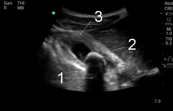 Bild, Gallenblase, transversal, akute Cholezystitis Schallschatten Cholelithiasis Verdickte Gallenblasenwand