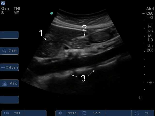 Bild: S-System, proximale Aorta, sagittal 2 Proximale Aorta abdominalis Leber Bauchspeicheldrüse Wirbelsäule