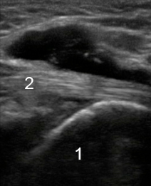 Bild: Sprunggelenk, medialer Erguss am Flexor hallucis longus, longitudinal Longitudinal Erguss am Flexor hallucis longus (FHL)