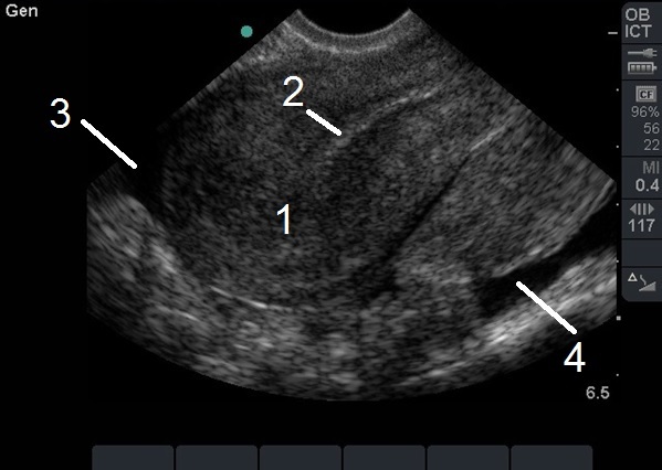 Bild: Transvaginaler (TV) Ultraschall des Beckens, ektopische Schwangerschaft, sagittal, leerer Uterus mit freier Flüssigkeit