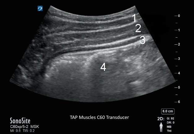 TAP-Muskeln mit linearer Schallsonde Darstellung der TAP-Muskeln mit Schallsonde C60 Musculus obliquus externus Musculus obliquus internus Muskel, transversal Peritonealhöhle
