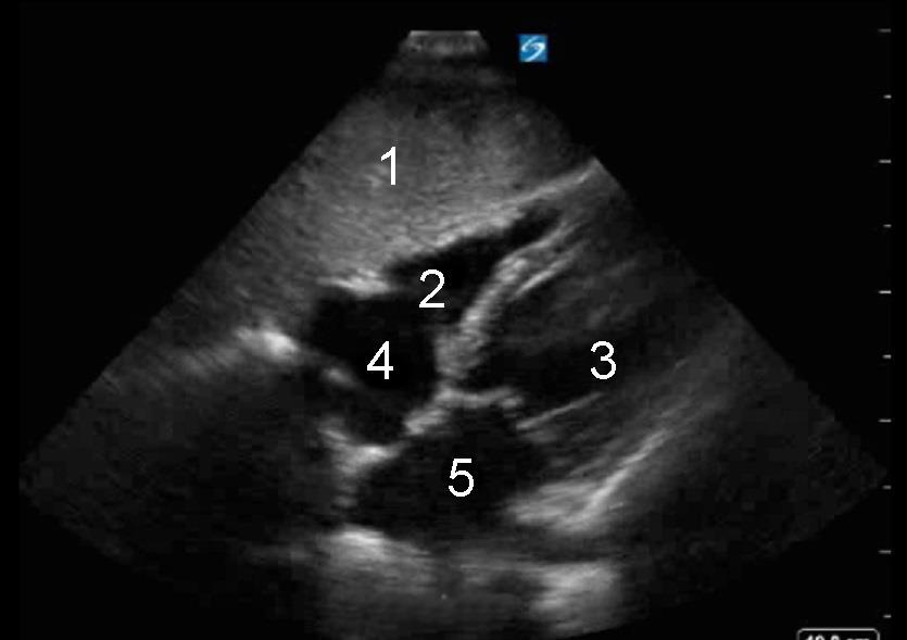Cardíaco: Vista desde el plano subxifoideo - Imagen Hígado Ventrículo derecho (VD) Ventrículo izquierdo (VI) Aurícula derecha (AD) Aurícula izquierda (AI)