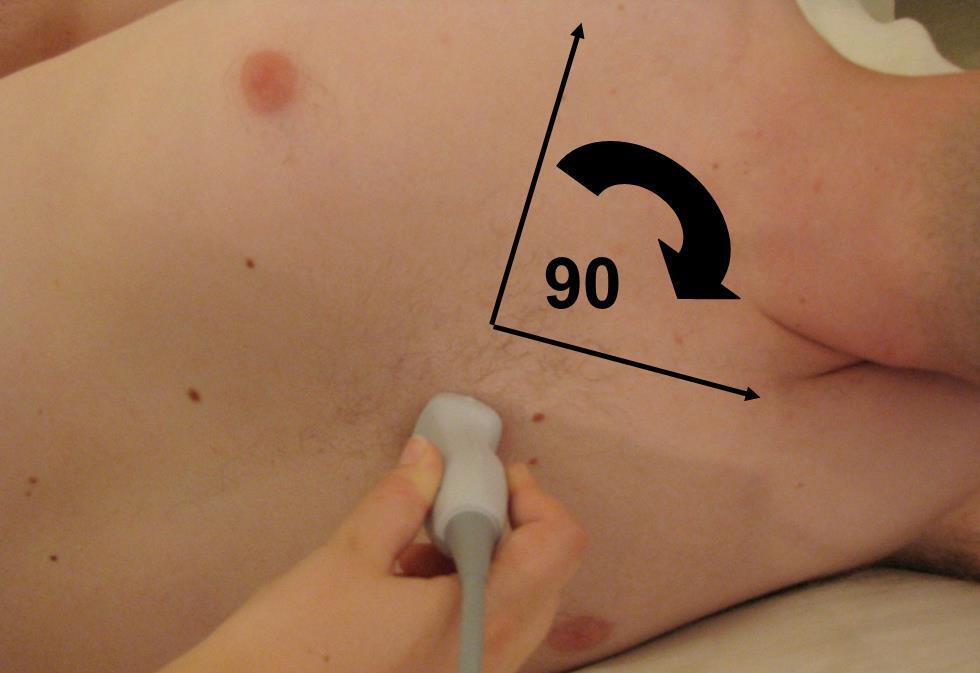 Cardíaco: Vista paraesternal en eje transversal de paciente y transductor - Gráfico