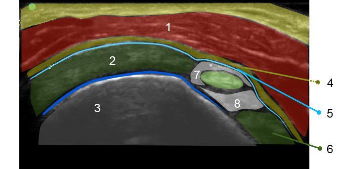 Imagen 1 de anatomía del supraespinoso del hombro Músculo deltoides lateral Tendón supraespinoso Cabeza humeral Grasa peribursal Bolsa subacromial/subdeltoidea Tendón subescapular Ligamento coracohumeral (LCH) Ligamento glenohumeral superior (LGS)
