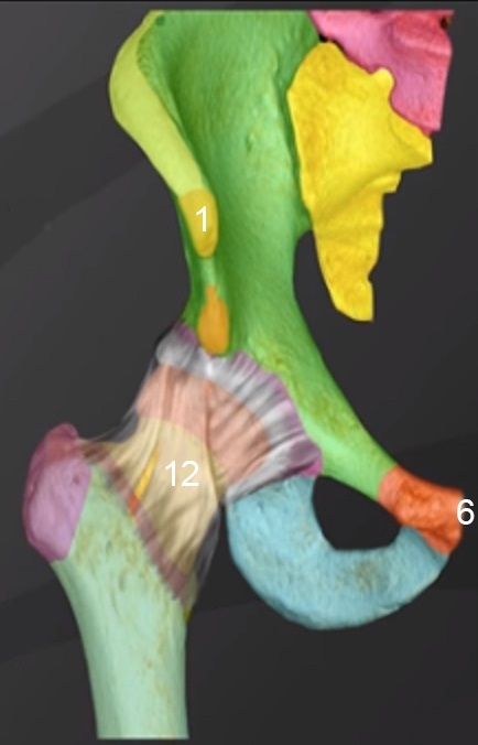 Imagen 2 de la anatomía de la zona anterior de la cadera 1. EIAS 6. Sínfisis del pubis 12. Ligamento iliofemoral (cápsula)
