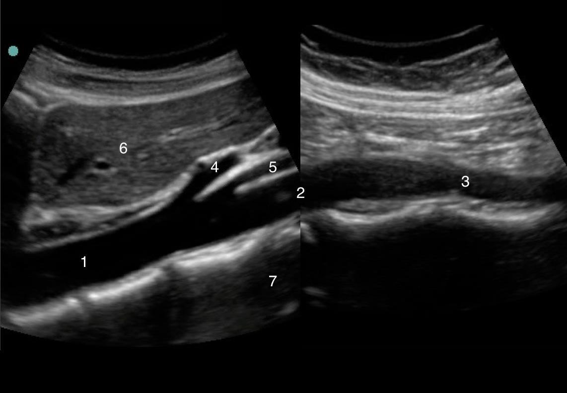 Imagen 2 longitudinal de la aorta Aorta (Ao) Aorta media (Ao) Aorta distal (Ao) Tronco celíaco Arteria mesentérica superior (AMS) Hígado Columna