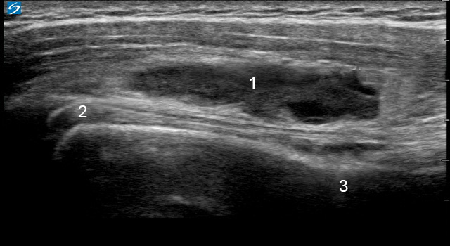Imagen de señal «en forma de gota» de bolsa subacromial del hombro Bolsa distendida anterior Tendón del bíceps (TB) Cuello SX anterior