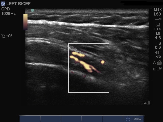 Image - Épaule : Ténosynovite du biceps, coupe grand axe en Doppler puissance
