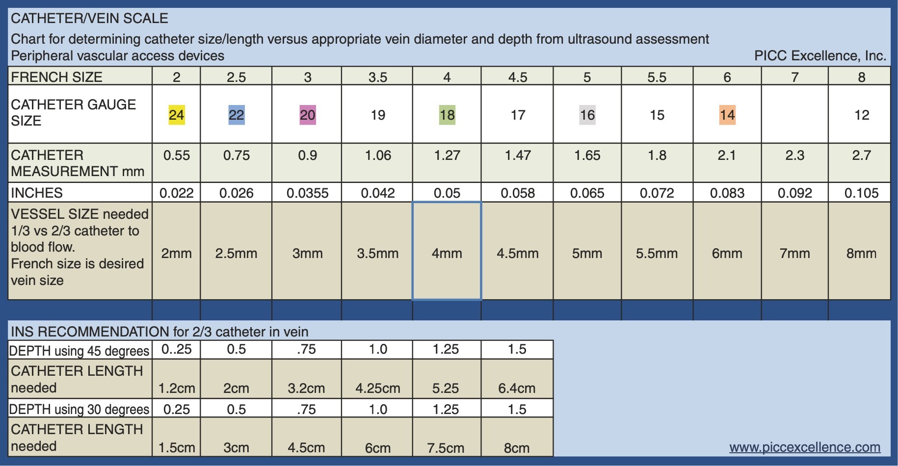 Peripheral IV (PIV) Catheter-Vein Scale based on current Gauge Sizes Graphic