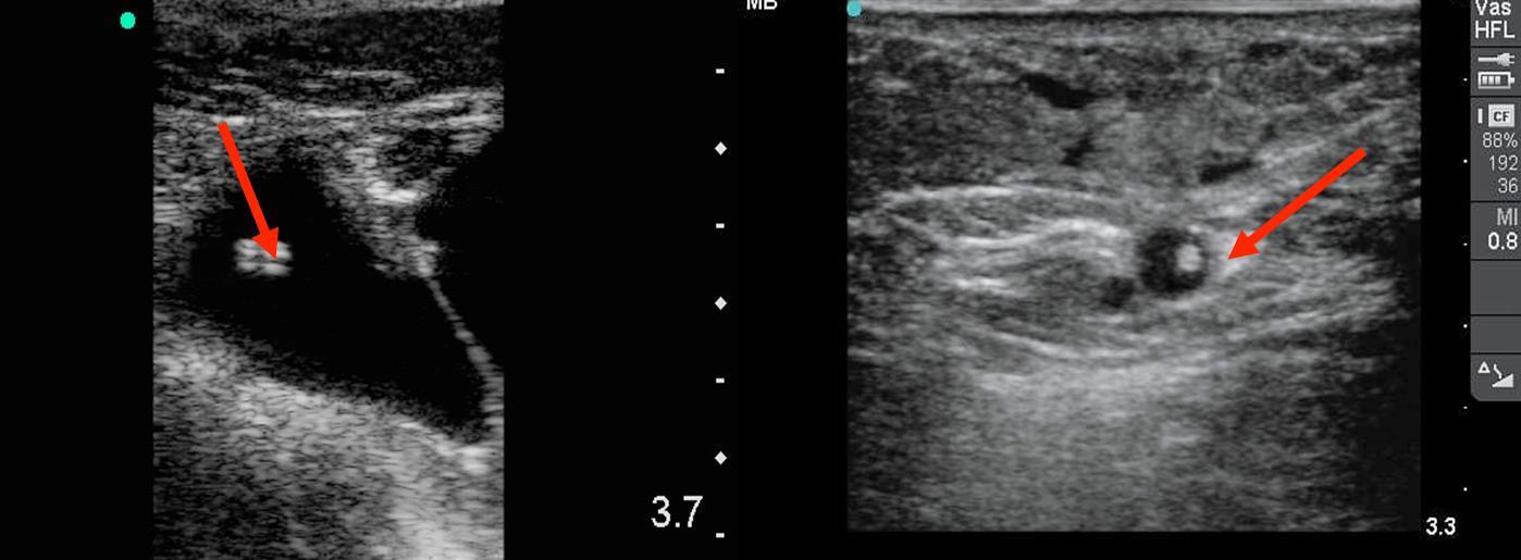 横断断面表示での末梢IV (PIV)カテーテルラインの画像
