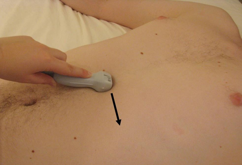 心臓の肋骨下4室断面/トランスデューサーと患者の図