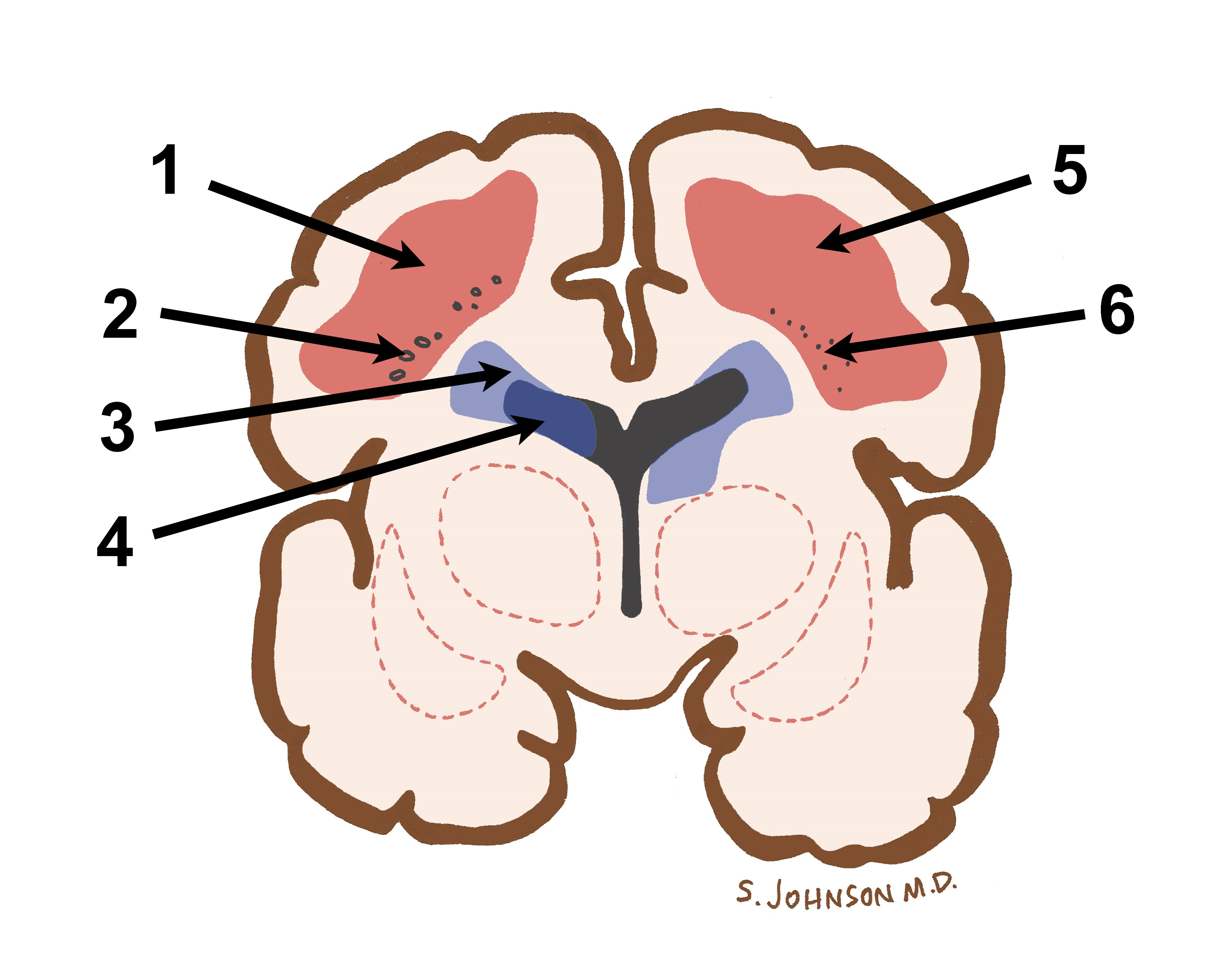 The right hemisphere shows non-cystic Periventricular Leukomalacia (PVL).